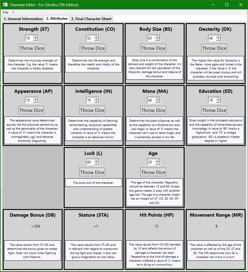 The Character-Sheet-Creation-Tool is also one of my student projects that I created in 2022 with WPF. My Goal was to create a simple tool to be able to create a basic character sheet for the pen and paper game Cthulhu.