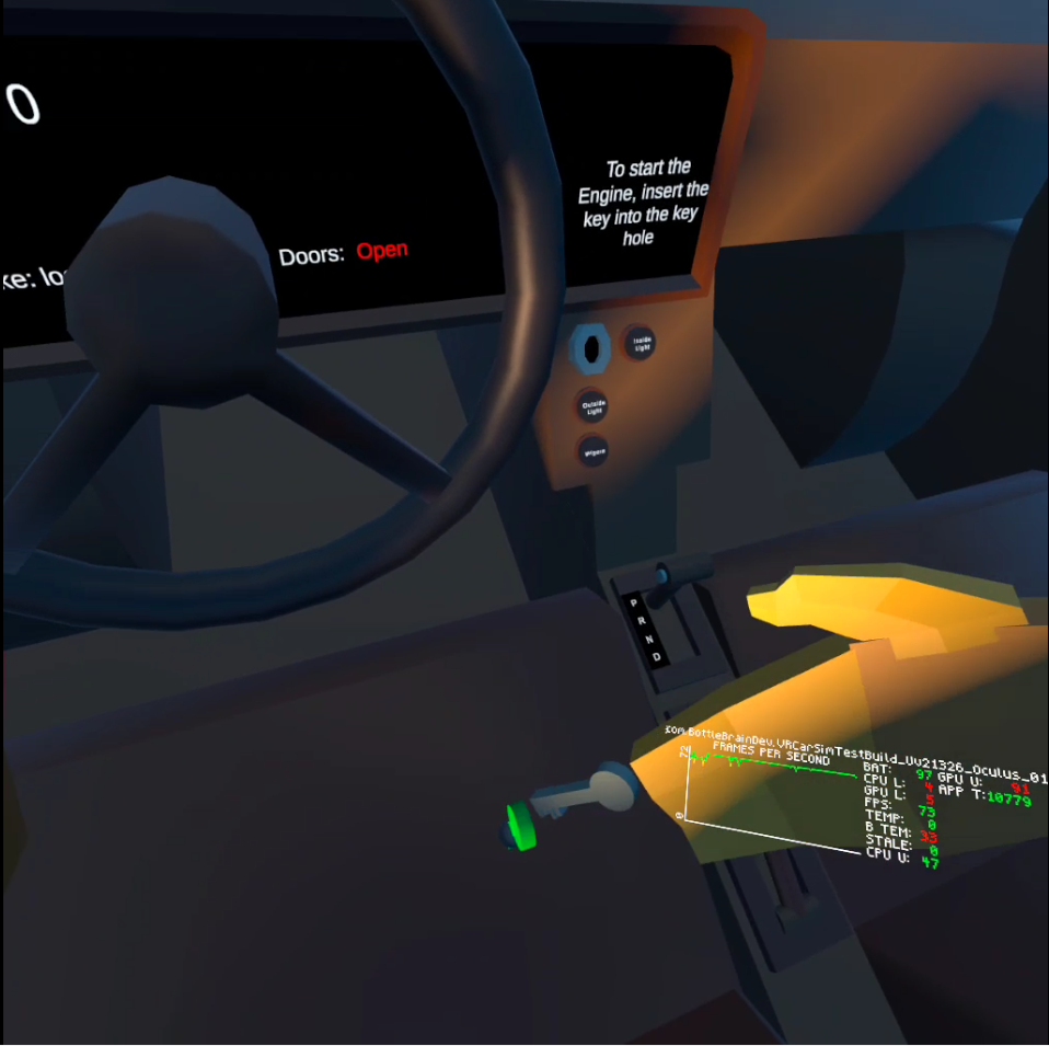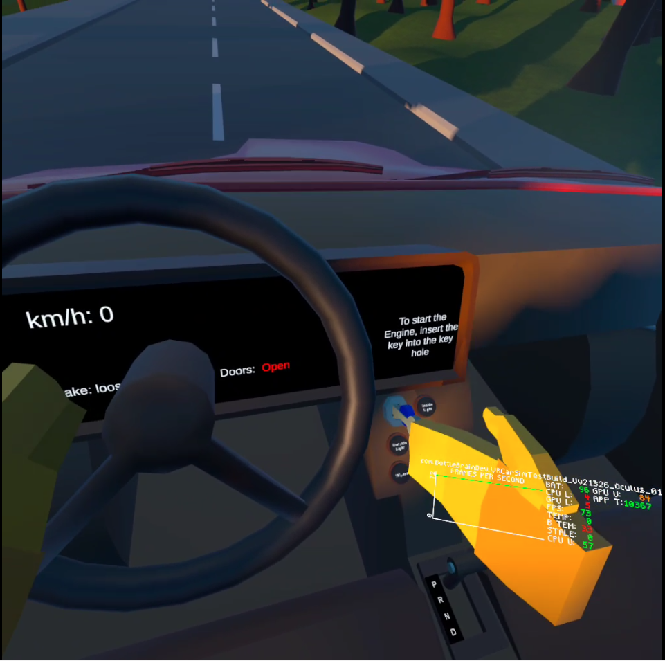 So far the Player is able to open/close the doors of the car, enter/exit the car, start the engine by inserting the car key in the according keyhole, interact with some further controlls inside the car (e.g. Light and wipers control), and of course drive and steer the car via the steering wheel all by using the device-controllers.