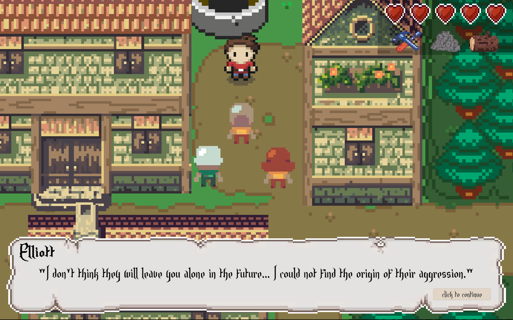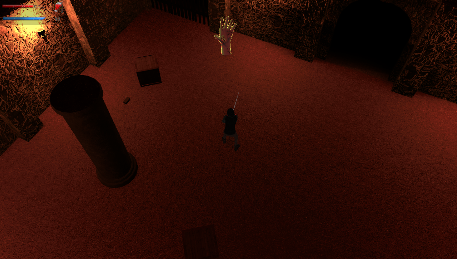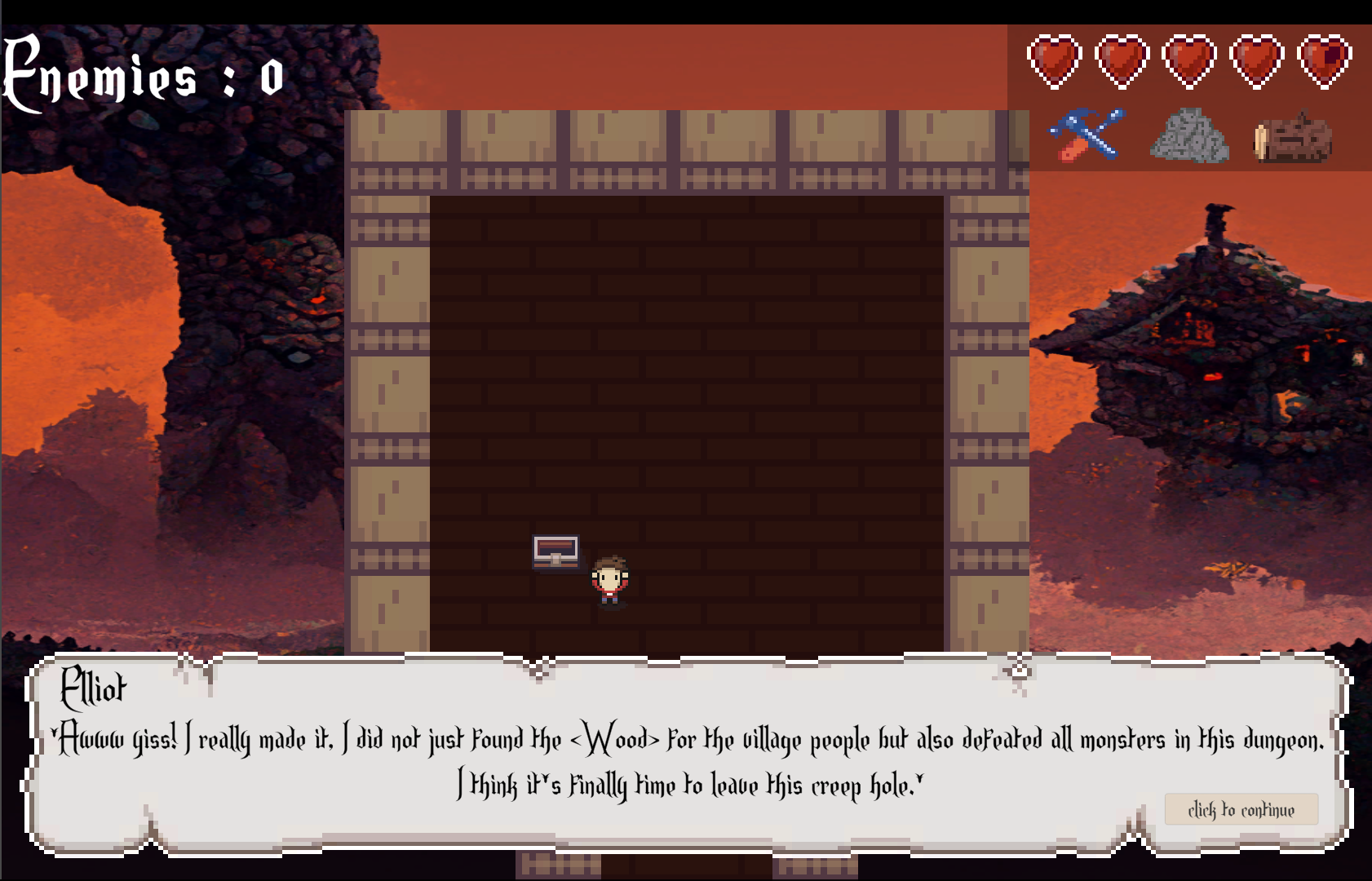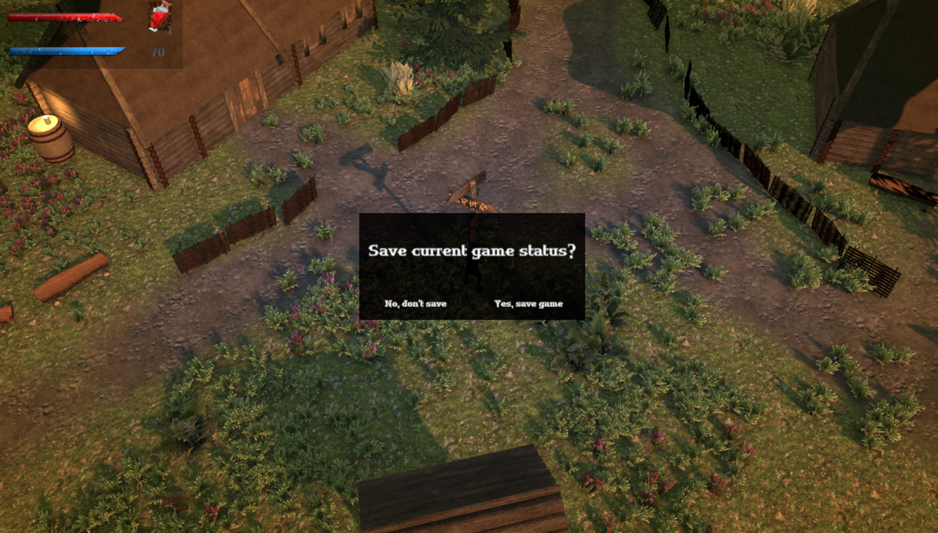 To help some villagers the player fights his way through three monster filled procedural generated dungeons to collect resources.
