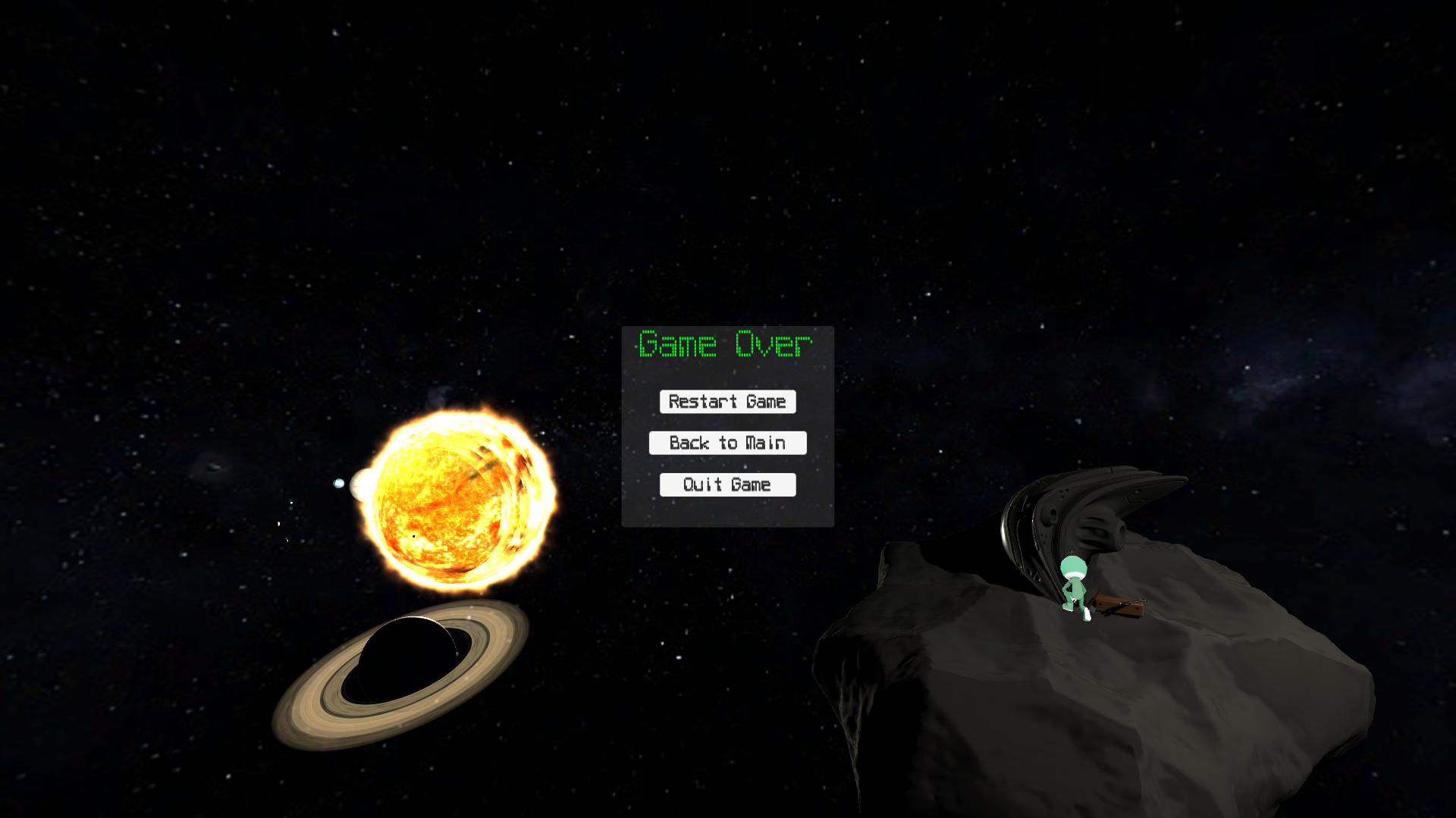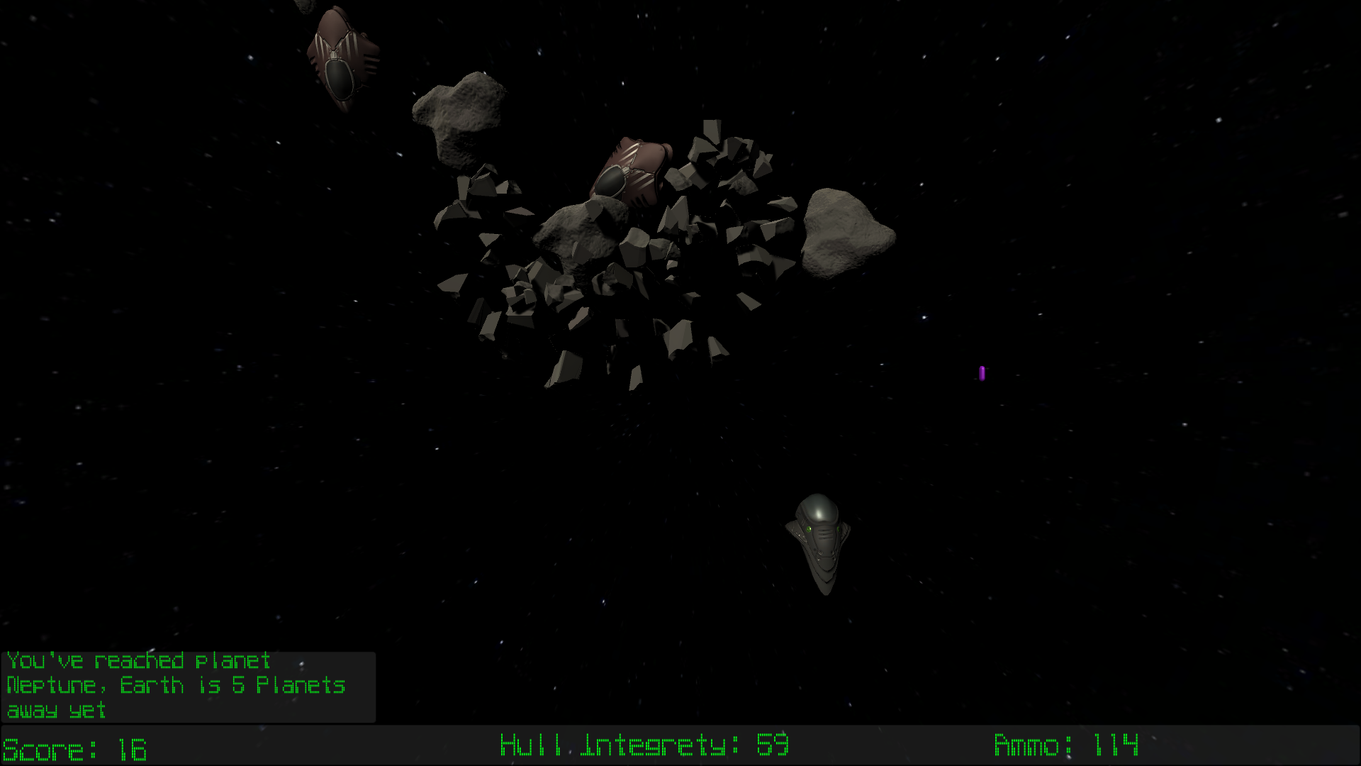 On his/her way from the outer Solarsystem towards earth the player needs to maneuver a Spaceship throuh fields of asteroids and shoot enemy spaceships as well as asteroids, that are not avoidable. Shooting objects or enemies will raise a highscore and the player has won the game once planet earth is reached after a certain amount of time.