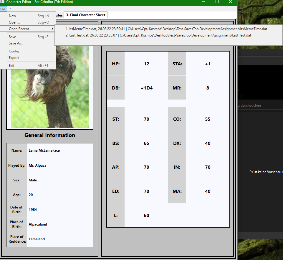 With the tool in its current state the user is able to set general information for his/her character, like adding a picture, setting the name, age or the place of birth. Further more the user can set values for specific attributes like strength (ST), stamina (STA) or education (ED) wether manually or automatically with random values by clicking an according button. Of course it is possible to save the sheet but also to export it to another file. The user can open quickliy the three last recent saved files or open any previously saved file. There is also a simple configuration menu implemented for adjusting the typography.